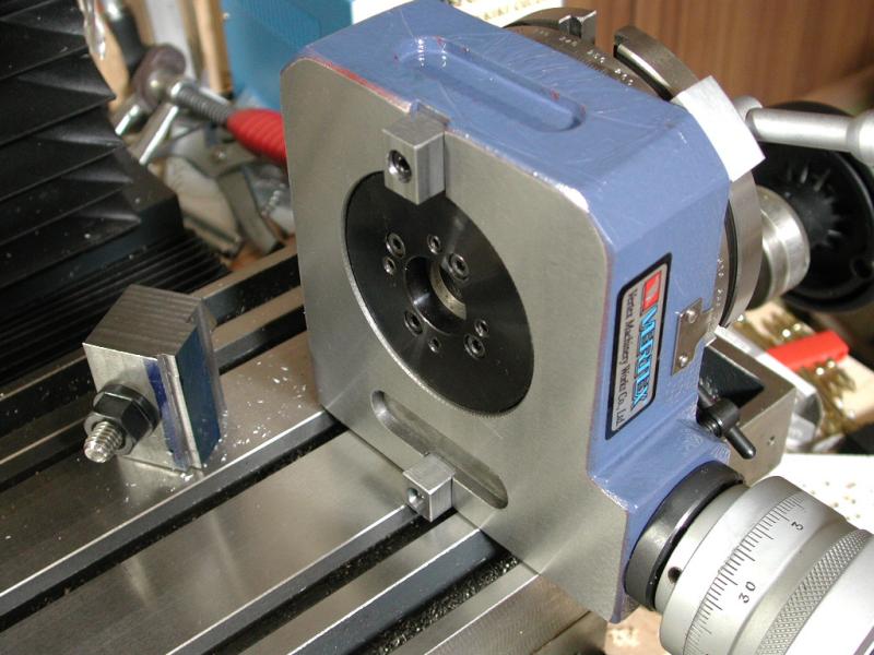 散らかってます ロータリテーブル固定 左にあるのは昨日作ったロータリーテーブル固定金具 周り止め金具 ヤスリで削るのをちょっと失敗 作ったパネルを装着