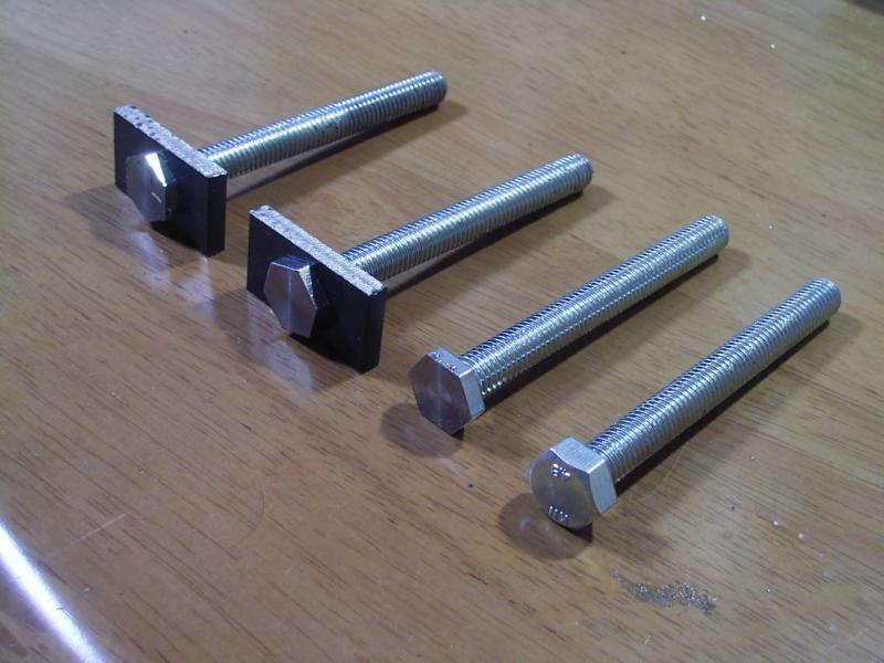 右から削る前、削ったもの、作ったTボルト ボルトの頭を削る フライスの台に物を固定するためのボルト Tボルト各種 穴空きブロックを使用するのに8mmのボルトを作成したのよ 使用状態