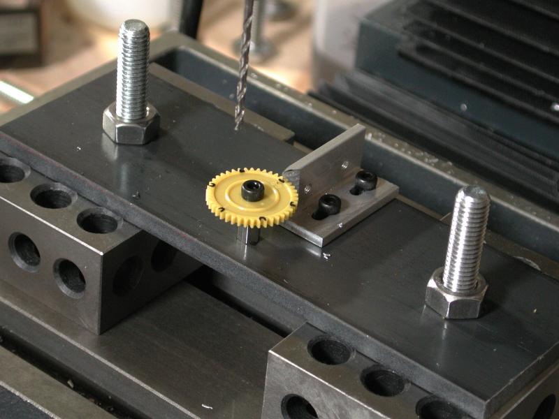 朝から、冶具をつくりプラスティックのギアに穴をあける。