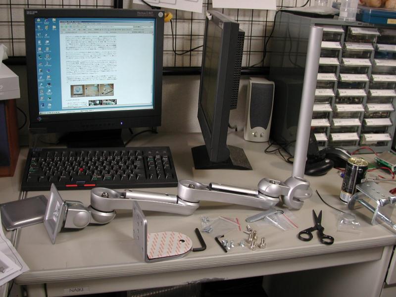 先週届いたLCDのアームを組み立てる。 EIZOの奴は思ったより大きくてすぐに諦める。 いつか使う日が来ることを祈ってお蔵入り。 MODERNSOLIDはなんとか治まる。 これでEAGLEを使う時にモニターをぐっと手前に持ってこれる。