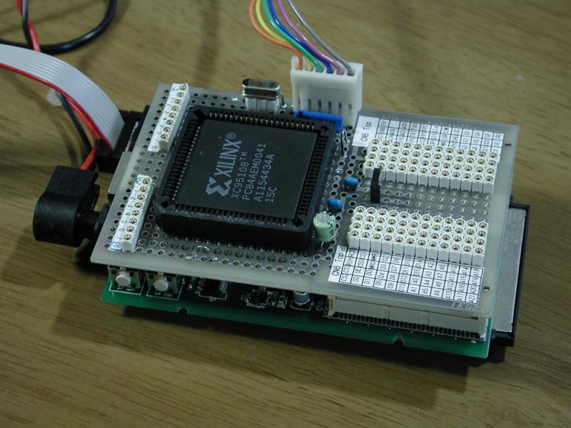 半田付けも済んだので、FPGAにプログラムを書いてみる。 クロックを分周して出力するだけの回路。 なんの問題もなく動いた。 この先は L-Card+側にクロスコンパイルしたモジュールを 転送しなければいけないが、自宅のネットワーク環境を いじっていたため、ちょっと手間取る。 モジュールを転送できたところで、今日はおしまい。