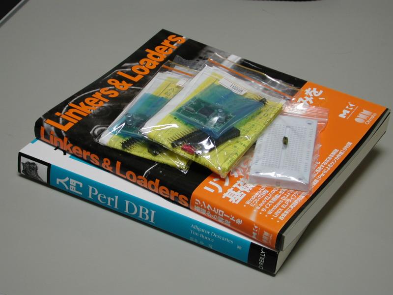 注文していたものがいろいろ届く。 まず、 秋月電子から H8/3664Tinyモジュール (1,600円) 2個と ブレッドボードの小さいやつ EIC-301 (300円) 2個。 H8/Tinyモジュールは 使いやすさに味をしめ、 いろいろ使いそうなので 2個購入。 これで通算購入個数は4個。 ちいさいブレッドボードの 味もしめ、 2個購入で通算4個。 続いて、 アマゾンより本2冊。 Linkers & Loaders は、 石川さんのホームページで知った本。 面白そう。 もう一冊は、 入門Perl DBI。 DBIは使っているが、大体いつも使い方を忘れているので、 perldoc DBIを印刷したものを読むことになるが、 あんまり見やすくないので 購入。