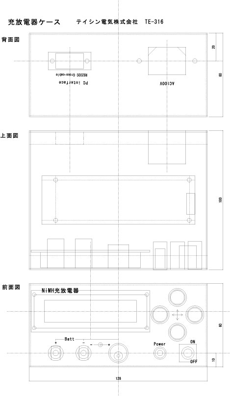 ニッケル水素充放電器の作り直しを始める。 以前作ったものは充分実用になっており、 実際使っているのだが、 サイズがでかく、常設できず、 使うのに 結構不便。 今度は、常設出来るサイズに作り直し、 CPUもH8/3664Tinyモジュールに変更、 プログラムもCで作り直そうという算段。 今回はケースが重要なので、どのケースの選定から始める。 使い勝手を考えると、前面にLCDとスイッチと端子を配置したい。 机の前に常設できるコンパクトなサイズで 実現しようとするとかなり大変。 お気に入りケースのYMシリーズだと、 かなりで大きくなってしまう。 20桁×4行のLCDも使って見たかったのだが、 相当大きなケースでないと無理そうなので、 16桁×2行のLCDで我慢し、 手持ちの小型ケースに納めるとにする。 ケースへの部品配置などを検討するために JWCAD ( Windows版 ) で図面を書き始める。 いつもは、方眼紙+手書きで書いていたのだが、 組み立て図面を残すのも悪くないし、 JW_CADにも習熟したいし、 ということで挑戦。 まだ、途中だが 悪くない感じ。 ケースの加工図も 趣味の成果物になり得る感じ。 つまり、あとで出来上がった加工図をながめて ニマニマ 出来そうだ。 プリント基板のパターンと一緒。