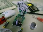 そこで、アンテナ端子を探して、すこし線を伸ばしてやれば到達距離が 延びるのではないかと考え、マウスをばらして見ました。