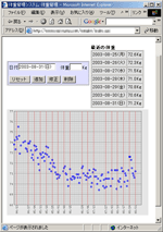 ゆっくりすごす。 ここ半年ぐらいダイエットをしているので、 毎日手帳に体重を記録しているのだが、 手帳に書き込むよりWeb経由でデータベースに書き込む方が楽だし、 グラフとか見れて楽しいだろうと体重DBアクセスCGIを作成する。 できたCGIを表示させたの右の画面。 まだ日付関係の処理が未完成だが、 グラフで表示できるようになったので、 手帳に記録したここ5ヶ月ぐらいのデータを打ちこむ。 大学時代ひつこく言われたことだけど、 グラフにすると数字のままではわからないことに いろいろ気がつく。 体重が順調にへったのは6月中旬まで。 その後はほぼ横ばい。 このころから雨が多かったり、 暑かったりで運動しなくなった。 先週体重が増えたのは、 4日連続で飲んだから。 まだダイエットは継続中なので、 運動量増やして、体重を落としたい。