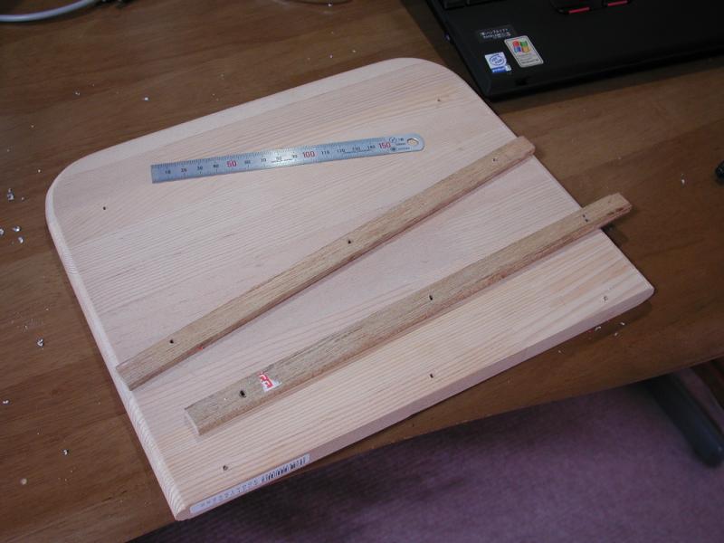 座ぐり後。実際にはもう少し深くしないと、 皿ネジの頭が隠れない。 ネジを取り替えるために分解したので、ついでに撮影。 木の板はホームセンターで購入。 610円。 木の棒は余り物。