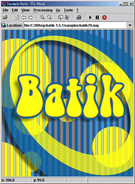 ものもらい直る。 ▲ Java2DやSVGを調べていて batikを知る。 これは javaでSVGを扱うツールキットで、 アプリケーションとしてSVGのviewerやRastererizer も含まれている。 SVGはグラデュエーションなども使え 表現力が高いので アプリケーションの見た目も派手だ。
