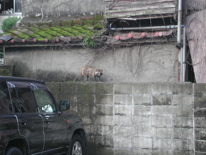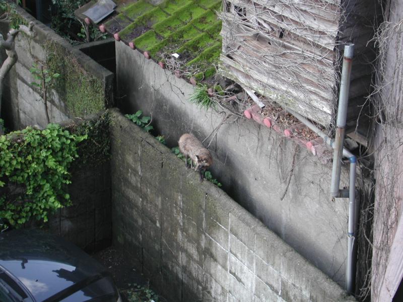 夕方、事務所のマンション裏の駐車場の壁の上に変な動物発見。