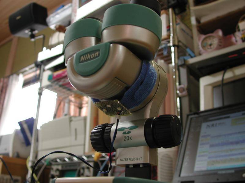 半田付け後の基板 半田付け後の基板。 スルーホールの基板ですので、 配線が楽です。背面で配線してあります。 結束具 基板を顕微鏡にとりつけるのに、束線用のマジックテープを使用しました。
