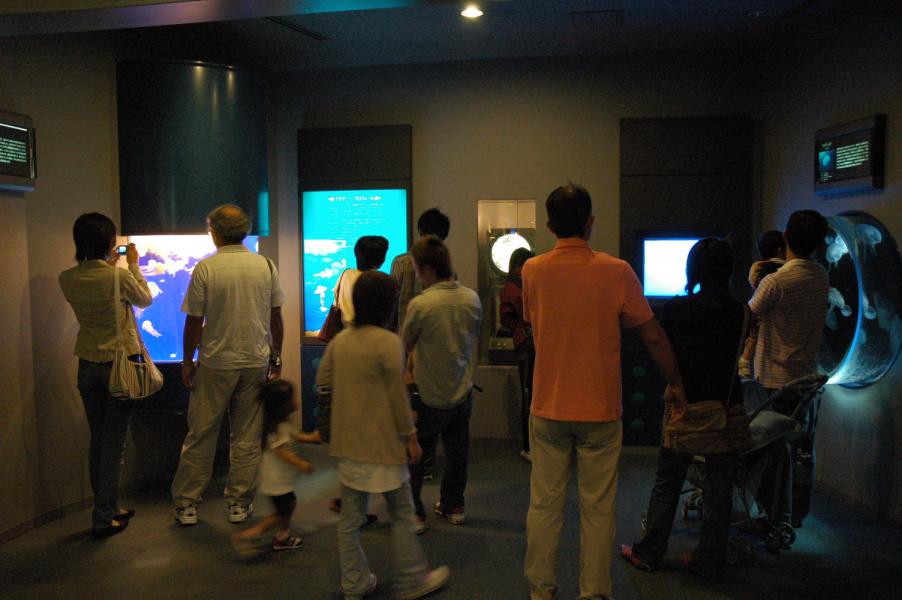 カメラのフラッシュをたくと、 ジンベイざめが驚いて壁に激突したりすることがあるそうで、 フラッシュは禁止。 みんなちゃんとフラッシュをたかずに撮影していて関心した。