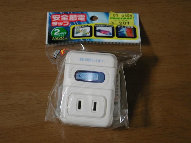 休日らしく Javaのプログラムなど書きつつゆっくり過ごす。 ▲ ハンズマンで安全節電タップ購入。 スイッチ付きのタップというか 二股ソケットでAC100VのOn/Offができる。 最近 ホームセンターでよくみかけるようになってきた。 大体 500円前後の値段だが 207円というものがあったので 買ってしまう。 ここで312円のやつかな? ▲ テニス。6-0で惨敗。反省する気も起こらない。