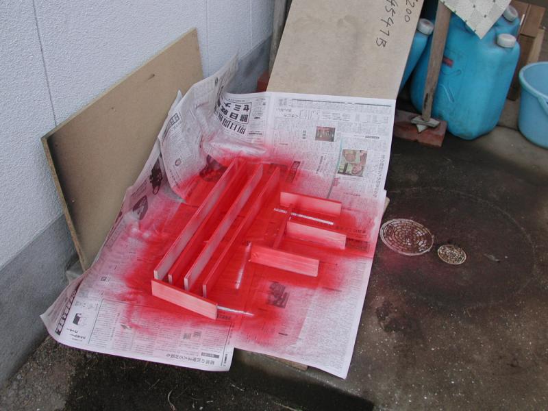 真っ赤 壁の端を赤く塗る なかなか色合いが派手 部品揃う 意外にコンパクトです。 完成