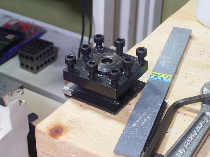 ボルトの頭を削って作ったのは8mmのTボルト。 TボルトというのはT溝が掘られたフライスの台に 被加工物を固定するときに使用するボルト。 上の真中の写真の、左にあるのが購入したTボルト。 真中2本がサイズがうまいこと合ってTボルトとして使用できる 3/8インチのステンレスのボルト。 左が今回製作した 8mmのTボルト。 8mmを作ったのは左の写真の穴空きブロックを使用するため。 この穴には3/8インチのネジが切ってあって、3/8インチでは 貫通できない。