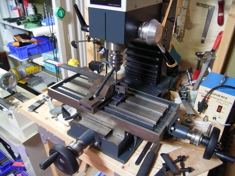 台風が近いので早めに帰宅。 ▲ ねじ切りの問題を解決すべく、太い輪ゴムを購入。 ボール盤が無いので フライス盤で鉄板に7mmの下穴をあけたあと チャックで8mmのタップを咥え 太い輪ゴムでフライス盤のレバーをひっぱり下がり勝手にする。 以前つくば工房で知った知った ボール盤でタップをたてる方法だ。 チャックを締める穴に鉄の棒を差し込みタップを回す。 タップが食い込みはじめるととチャックがすべるので、 モンキーレンチで直接タップを回したりしつつなんとか タップを切っていく。 ある程度切れたところで、チャックを外し 今度はタップ回しで回す。 という手順で今度はちゃんと垂直にネジを切ることができた。 ▲ チャックで固定している状態でタップが滑らなければもっと 楽そうなので、なんかうまい金具を作ろうかと考えてみたりする。