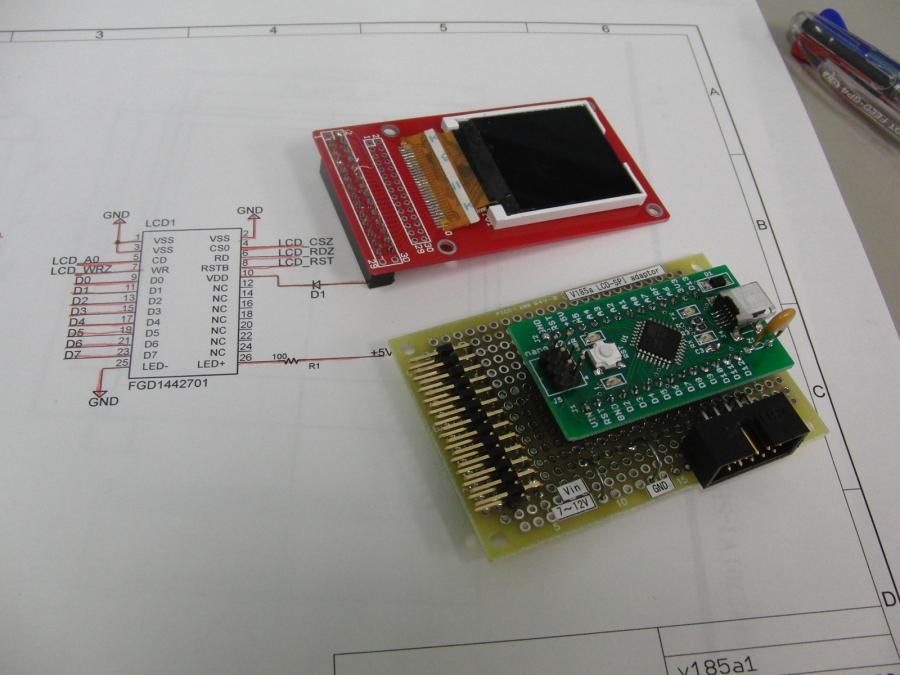 年末(2)年内にカラーLCDを光らせておきたいと考え、 接続ボードを作成開始。 CPUはArduinoを使うことにして、 最近足りない気味の 自作Arduinoを2枚補充。 回路図作成、配線と順調に進み、 サンプルプログラムを参考に初期化ルーチンを作ってみたら、 あっさり光ってしまった。