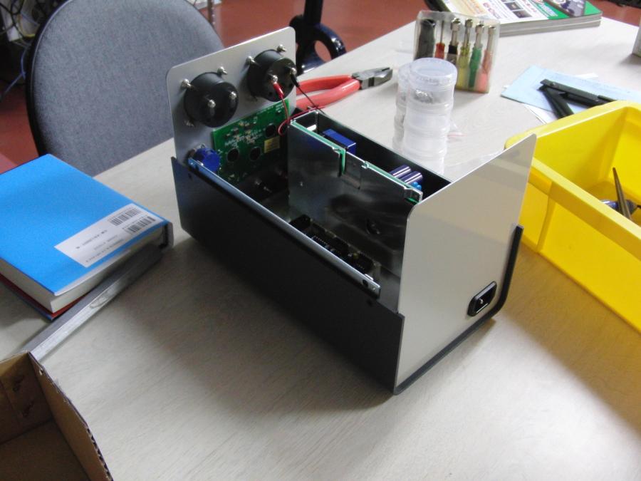 昨日のシャーシ加工の続き。 大部分の切り口は部品に隠れて見えない。 グラフィック液晶の穴だけ切り口が見えて汚いので、 得意のレーザ加工機でアクリルを切り出して切り口を隠そう。 トグルスイッチのナットをペンチで回したら 予想通り塗装を傷つけてしまった。 スパナで回すべきだった。