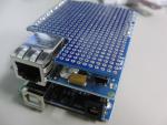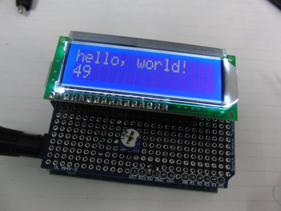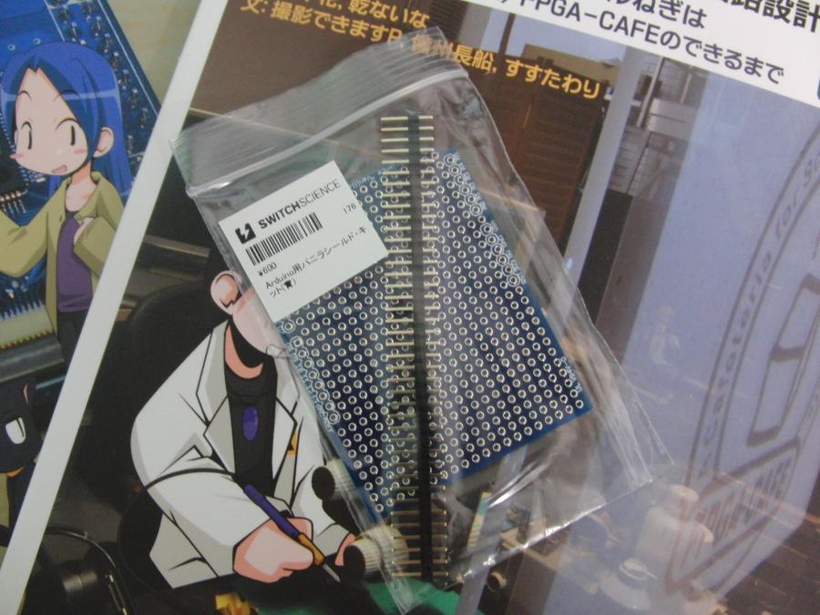 LCDシールド製作ArduinoをEtherシールドと遊んでいると 表示装置が欲しくなってきたので、 ユニバーサル基板(バニラシールド)と キャラクタLCDを購入し、LCDシールドを作成した。 バニラシールドには、ピンヘッダが付属するが、 これでEtherシールドに取り付けると、 コネクタが干渉し、ピンヘッダがちゃんと刺さらないので、 基板の一部を切除。 部品を取り付け、配線するが、ピンヘッダが基板の両面にあるので、 配線も基板の両面で行う必要があり面倒。 配線終了後、LCDライブラリのExampleにあるプログラムを書き込み 動かすが動かない。いろいろ調べ、 オシロスコープのプローブでLCDのRW端子を触ると、 変な字が表示されることが分かった。 電圧を見ると1Vぐらい。 RW端子はGNDに落とせばいいのだが、 変な色気を出して10KΩを介してGNDに落としたのが 間違いだったようだ。LCD側で50KΩぐらいでプルアップされているらしい。 抵抗を1KΩに変更し、表示できるようになった。