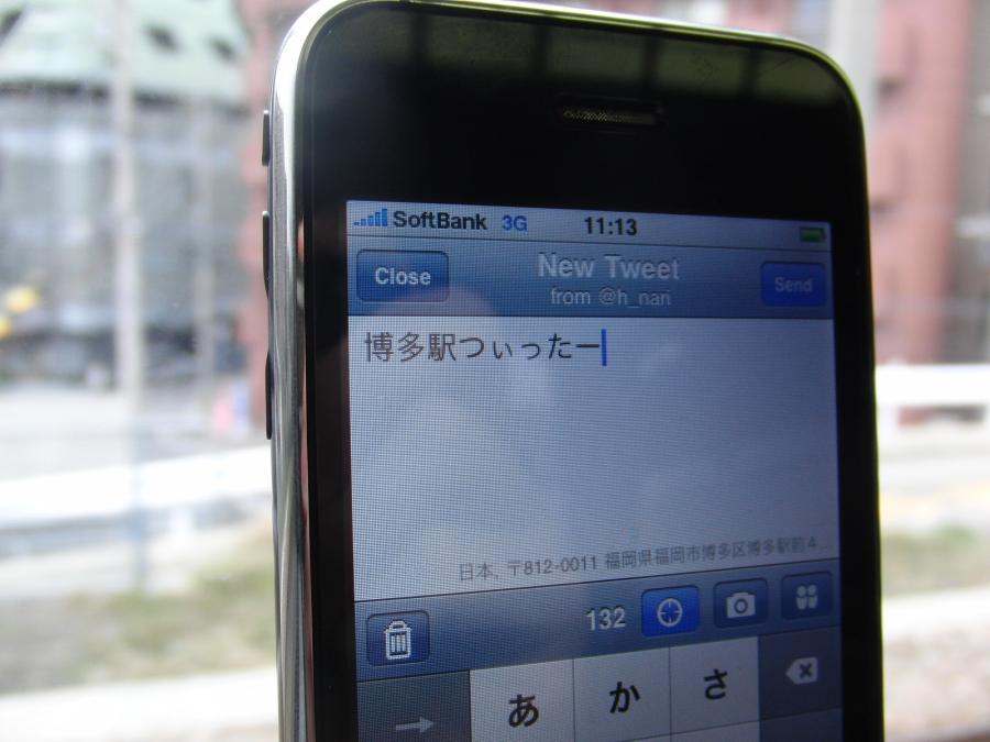 kick4 定例会久しぶりの kick4定例会に参加すべく博多へ移動。 早い時間なのでJRで座れないことを恐れて 指定席を予約してみるが満席で取れない。 諦めて熊本駅に向かうと 十分空席があるリレーつばめが既にとまっていた。 新八代発の車両と熊本で連結し11両編成で博多に向かうらしい。 JR九州エライ! 移動中はiPhoneでtwitterしたりgoogle mapを眺めたり。 列車でgoogle mapを見ていると、現在位置がちゃんと追従することを 今回知った。 kick4定例会は、今回は幹事がいろんなところで声をかけたおかげで、 参加者15名とひさびさの大人数での会となった。 発表も展示物も多く見ごたえ充分。 特に、CupCake CNC ( リンク1, リンク2) のプレゼンと展示が大人気だった。 幹事の撮った写真は こちら。 ありがとうございました>幹事さんと参加者の皆さん。